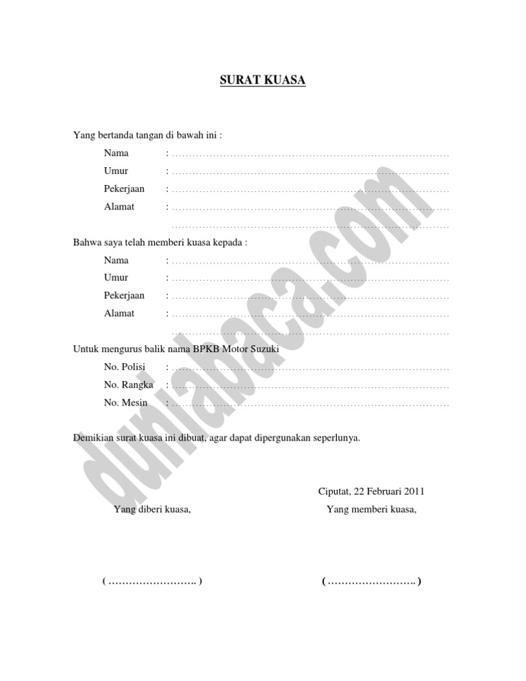 | Judul: Contoh Surat Kuasa Balik Nama Motor R2 Di Samsat Menurut Uu Perdata |